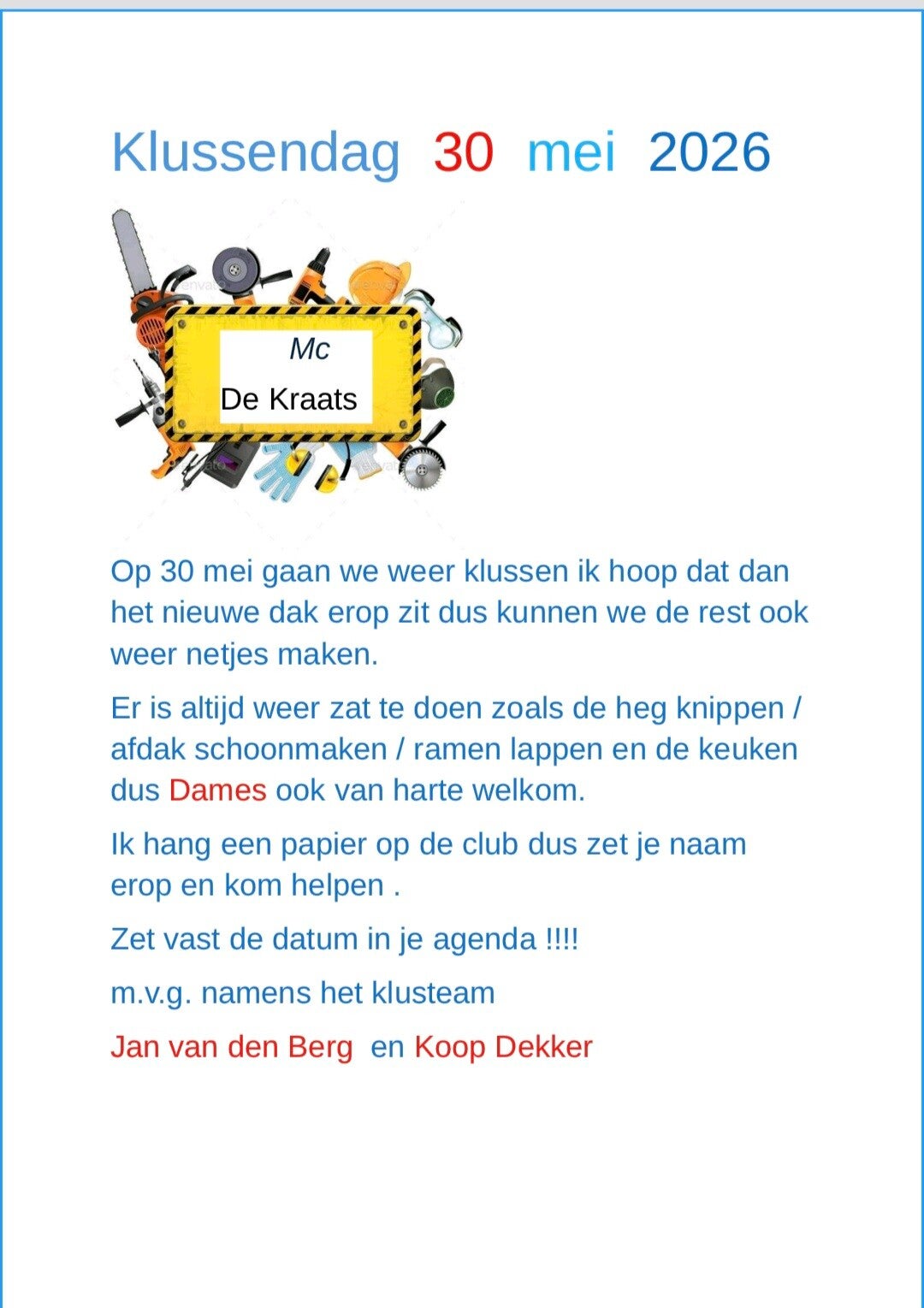 Op 30 mei 2026 organiseren wij een klussendag om het onderhoud van ons clubhuis en terrein aan te pakken. Dit omvat onder meer de reiniging van het interieur en de inventaris. Met deze dag willen we ervoor zorgen dat onze clubruimte er altijd netjes en uitnodigend uitziet voor iedereen.
